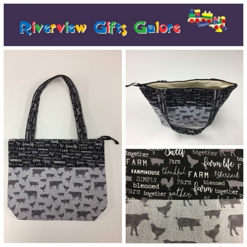 Medium Tote Bag with Zip - Farm Sweet Farm - Charcoal and Animals