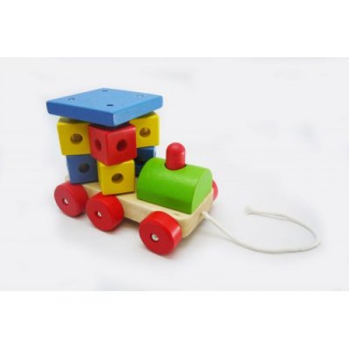 Wooden pull along block engine. Wooden blocks spin when the engine is pulled along.