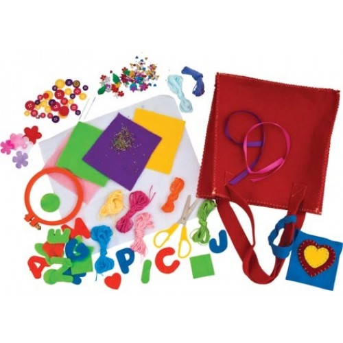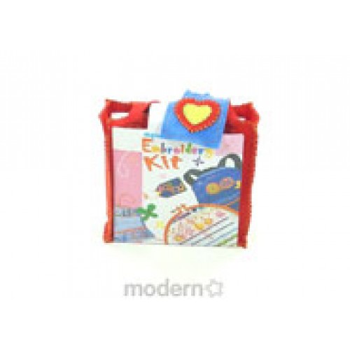 A super embroidery kit comes with 8 colours of threads, 1 pair of scissors, 2 safety needles, sequins, buttons, fabric flowers, felt butterflies, 5 x 13cm coloured felt squares, felt letters, 2 ribbons, seed beads, practice cloth, 2 transfer papers, a plastic embroidery frame and picture instructions.